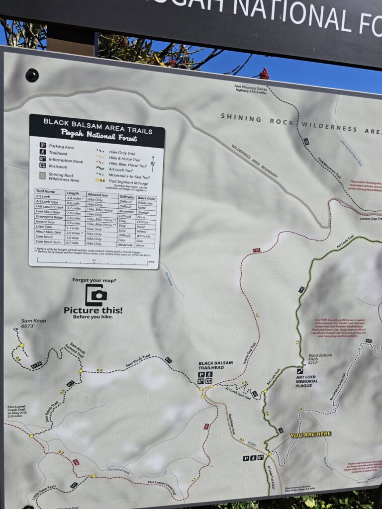 Hike the Trails: With over 11 miles of interconnected trails, there’s something for every level of hiker. The summit trail is a must-do, offering breathtaking views of the surrounding mountains. We hiked the short track up to Black Balsam Knob with our dog, Benji, and he enjoyed scrambling up the rocky incline more than we did. I would call this a moderate hike, with approximately 425 feet in elevation over a distance of about 0.7 miles. This trail is part of the Art Loeb Trail system, begins in a dense balsam fir forest and ascends through rocky, grassy mountain meadows to reach the treeless summit at 6,124 feet. The view from the top was an amazing 360 degree panorama – and definitely made the hike worth the effort. Whether you’re a leaf peeper or just love the great outdoors, Black Balsam Knob is a must-visit this fall.